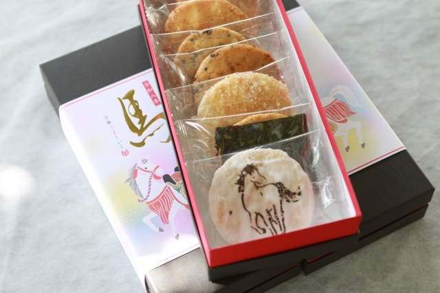 干支のイラストが入ったおせんべい。かわいい掛け紙付きで大好評♪のり、ごま、しょうゆ、ざらめ味にイラストが印刷された甘辛せんべいの5種類の味。